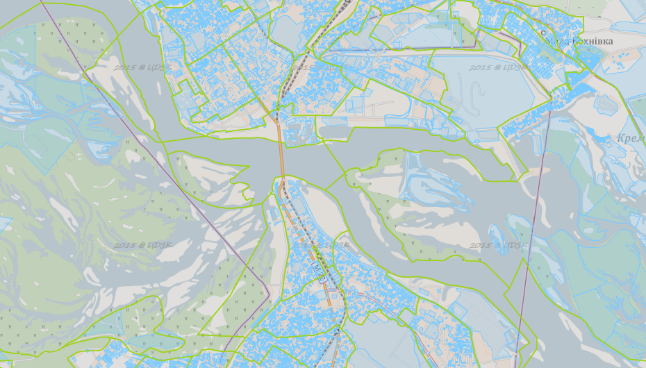 *Фіолетовим кольором позначені межі міста на яких видно, що частково острови «Зелений» та «Динька» частково знаходяться на території Кременчука, а частина – Білецьківські плавні. Острів «Фантазія» – в межах Кременчука.