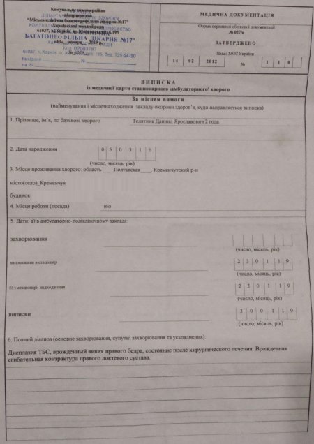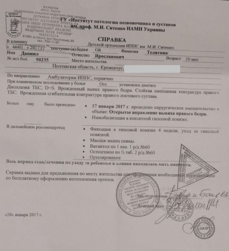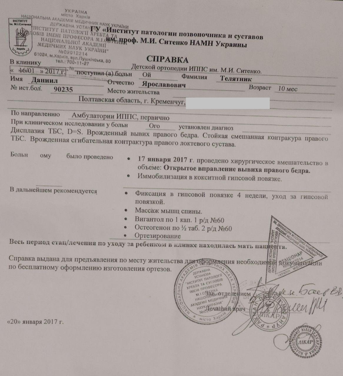 Як виявилося, у старшого Данііла є проблеми із здоров'ям. У хлопчика вроджена патологія, встановлений діагноз: вроджений вивих правого стегна, дисплазія кульшового суглоба, вроджена згинальна контрактура правого ліктьового суглоба. Дитина зараз росте й зміцнюється організм, тому треба терміново проводити операції, щоб виправити вивих. Дитина вже перенесла дві операції у Харкові, необхідна ще одна складна операція з ендопротезування кульшового суглоба із використанням імпланту. Для придбання даного імпланту та її проведення потрібна значна сума коштів. Операція коштує приблизно 60 тисяч гривень, також необхідна в подальшому операція для ліктьового суглоба.