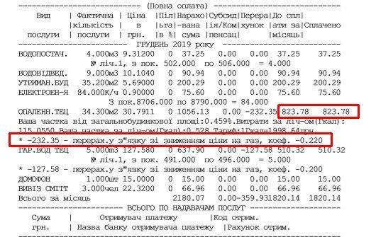 - За фактом платіжка в мешканців однокімнатної квартири 34,3 кв м (у будинку з лічильником) вийшла «легшою» на 232 грн, сума в рахунку склала 824 грн.
