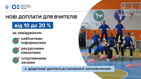 Документ передбачає більше доплат для вчителів, зокрема від 10 до 20% від зарплати за завідування ресурсними кімнатами, кабінетами інформатики та спортивними залами. Окрім цього, педагоги зможуть отримувати додаткові доплати, які завдяки Закону матиме змогу встановлювати засновник закладу.