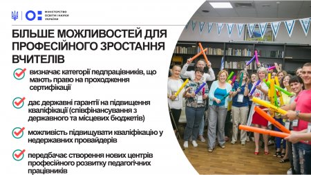 Новий Закон встановлює державні гарантії на підвищення кваліфікації вчителя та передбачає його співфінансування з державного та місцевих бюджетів, можливість підвищувати кваліфікацію у недержавних провайдерів, створення нових центрів професійного розвитку педагогічних працівників.