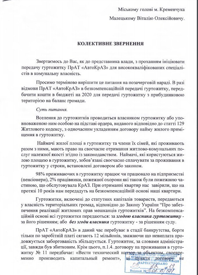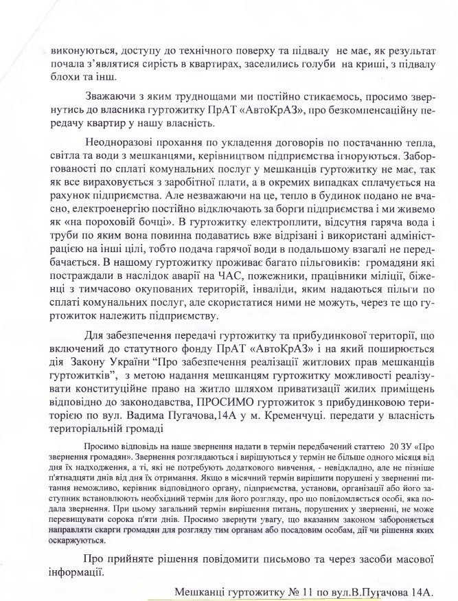 До цього мешканці гуртожитку ПрАТ «АвтоКрАЗ» писали колективне звернення міському голові з проханням, щоб влада розглянула питання про передачу гуртожитку до комунальної власності. Редакція має копію цього листа.