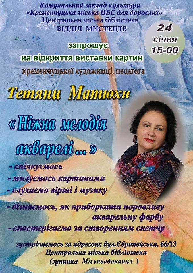 Сьогодні, 24 січня, о 15.00 відбудеться відкриття виставки картин художниці та педагога Тетяни Матюхи* «Ніжна мелодія акварелі…». За інформацією пресслужби мерії Кременчука, побачити її твори та поспілкуватися з мисткинею кременчужани зможуть у відділі мистецтв Центральної міської бібліотеки на вулиці Європейській, 66/13.