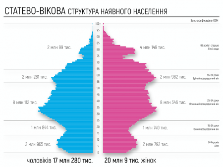 Перший метод - це мобільні оператори, соцопитування і реєстри, другий - дані Пенсійного фонду і поширення через статево-вікову структуру та третій - реєстровий. Із 37 млн 289 тис: діти - 15,4%, люди раннього працездатного віку (15-24 років) - 9,6%, основного працездатного віку (25-54 роки) - 44,1%, зрілого (55-64 роки) - 14,1% , літніх людей (65 років і старше) - 16,8%, або 6,248 млн осіб, - повідомив на своїй сторінці в фейсбук міністр Кабінету міністрів Дмитро Дубілет.