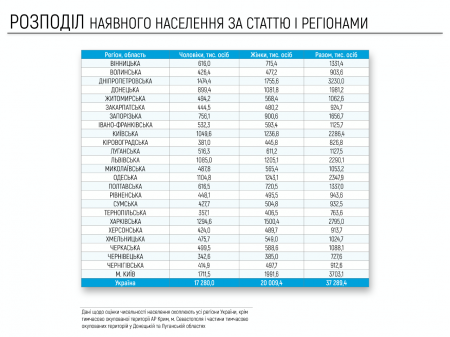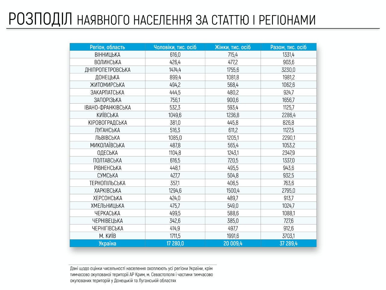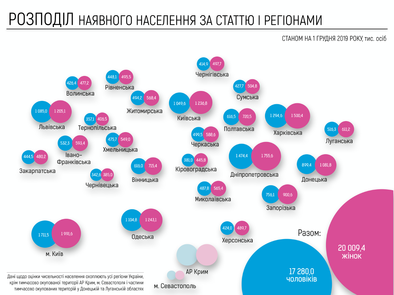 В Україні нарахували 37 мільйонів 289 тисяч осіб, саме таку кількість нарахували станом на 1 грудня 2019 року. Згідно з інформацією міністра Кабінету міністрів Дмитра Дубілета, в Україні живе 20 млн. жінок і 17 млн. чоловіків. До цієї статистики не входить окупований Росією Крим та окремі райони Луганщини й Донеччини. Відхилення у статистиці становлять не більше 2,86%.