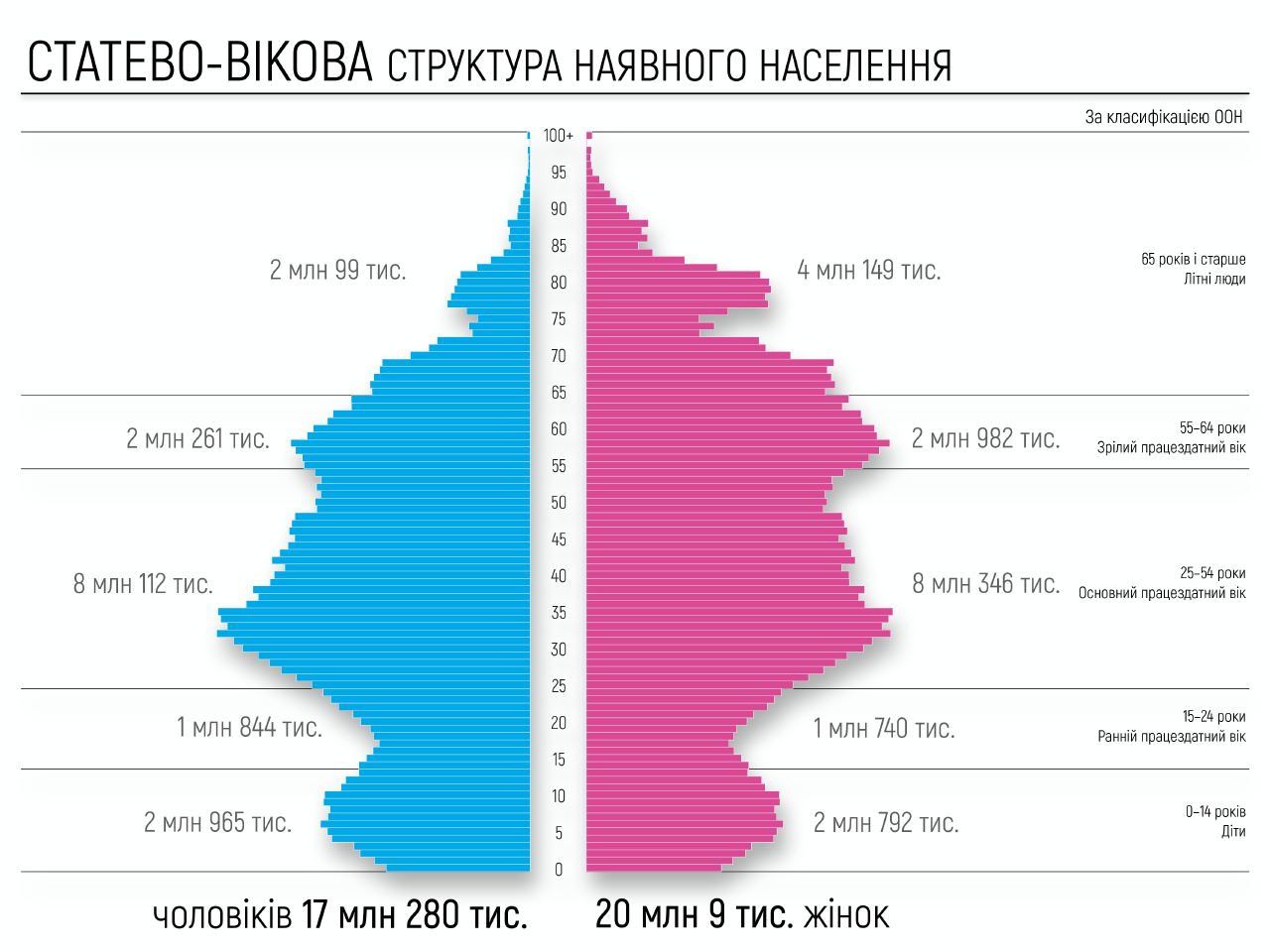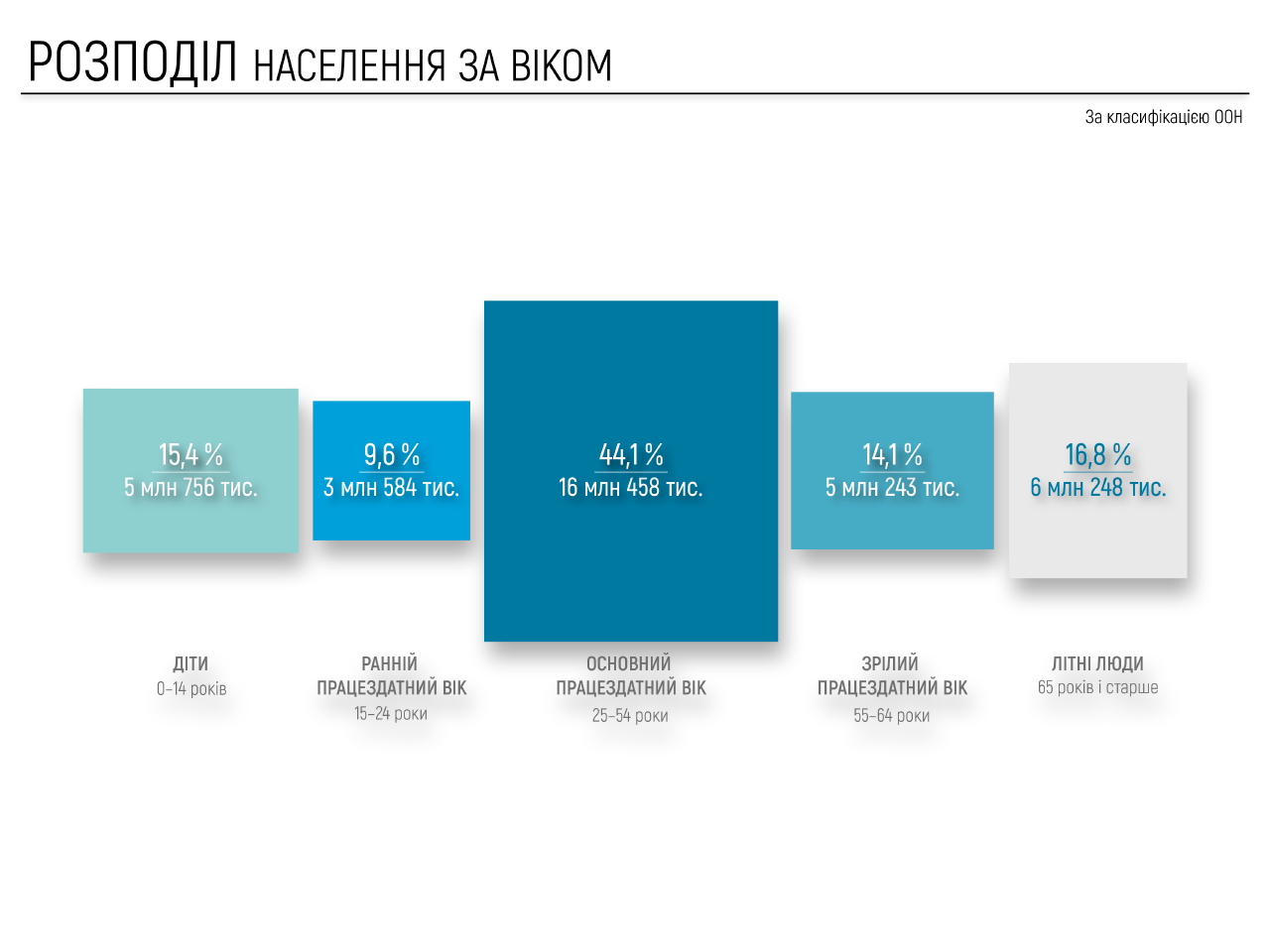 Перший метод – це мобільні оператори, соцопитування і реєстри, другий – дані Пенсійного фонду і поширення через статево-вікову структуру та третій – реєстровий. Із 37 млн 289 тис: діти – 15,4%, люди раннього працездатного віку (15-24 років) – 9,6%, основного працездатного віку (25-54 роки) – 44,1%, зрілого (55-64 роки) – 14,1% , літніх людей (65 років і старше) – 16,8%, або 6,248 млн осіб, – повідомив на своїй сторінці в фейсбук міністр Кабінету міністрів Дмитро Дубілет.