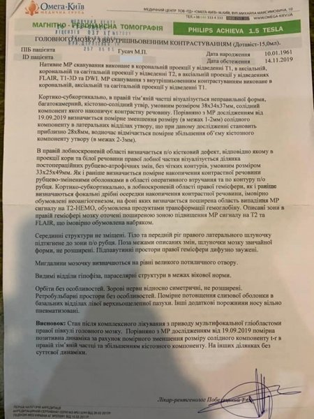 Кременчужанці Марії Гусач лікарі встановили діагноз мультифокальна гліобластома правої півкулі мозку. Жінка у 2016 році зробила операцію і пережила курс хіміотерапії та променевої терапії. Проте за кілька років хвороба наздогнала кременчужанку. Зараз у жінки німіє ліва частина тіла й родина терміново почала пошуки коштів на операцію.