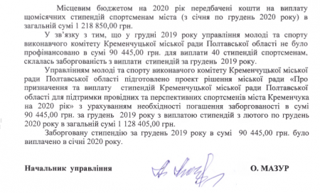 Управлінням молоді та спорту виконавчого комітету Кременчуцької міської ради Полтавської області підготовлено проект рішення міської ради «Про призначення та виплату стипендій Кременчуцької міської ради Полтавської області для підтримки провідних та перспективних спортсменів міста Кременчука на 2020 рік» з урахуванням необхідності погашення заборгованості в сумі 90 445,00 грн. за грудень 2019 року з виплатою стипендій з лютого по грудень 2020 року в загальній сумі 1 128 405,00 грн. Заборговану стипендію за грудень 2019 року в сумі 90 445,00 грн. Було виплачено в січні 2020 року. - йдеться у відповіді.