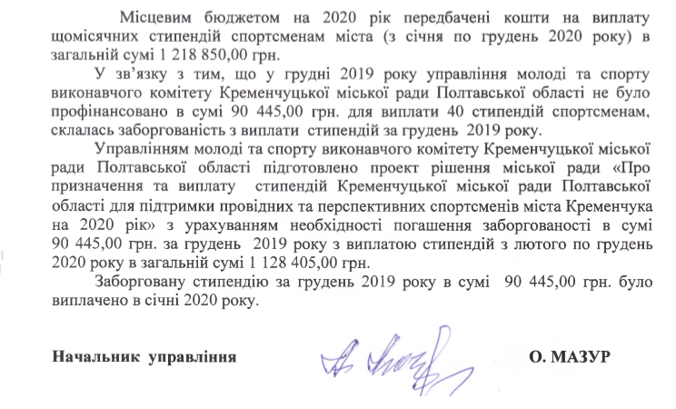 Управлінням молоді та спорту виконавчого комітету Кременчуцької міської ради Полтавської області підготовлено проект рішення міської ради «Про призначення та виплату стипендій Кременчуцької міської ради Полтавської області для підтримки провідних та перспективних спортсменів міста Кременчука на 2020 рік» з урахуванням необхідності погашення заборгованості в сумі 90 445,00 грн. за грудень 2019 року з виплатою стипендій з лютого по грудень 2020 року в загальній сумі 1 128 405,00 грн. Заборговану стипендію за грудень 2019 року в сумі 90 445,00 грн. Було виплачено в січні 2020 року. – йдеться у відповіді.