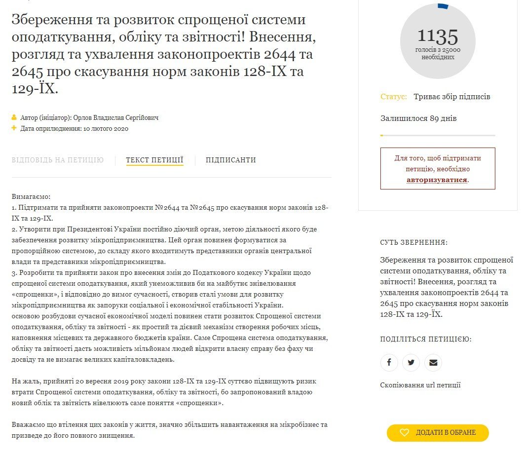 Бізнес просить Зеленського зберегти спрощену систему оподаткування. Петиція про це з’явилась на сайті президента 10 лютого. Створив звернення Владислав Орлов.
