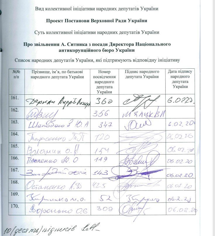 И 5 февраля Дубинский начал сбор подписей в Верховной Раде за отставку Сытника. 7 февраля нужное количество подписей собрали и зарегистрировали документ в аппарате Рады. 11-го проект Постановления об увольнении Стыника с поста директора передали в головной Комитет для анализа. Процесс пошел.