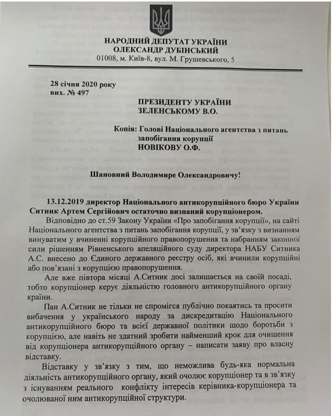 Потрясенный таким нахальством директора НАБУ, нардеп Дубинский решил добиваться его увольнения. И 28 января написал официальное письмо президенту Зеленскому с требованием уволить директора-коррупционера.