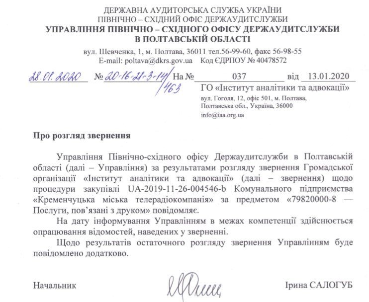 Управління Північно-Східного офісу Держаудитслужби в Полтавській області опрацьовує звернення ГО «Інститут аналітики та адвокації» щодо порушень у ході тендеру на друк газети «Кременчуцькі новини», який проводило КП «Кременчуцька міська телерадіокомпанія». Нагадаємо, вартість закупівлі – 9,3 млн грн.