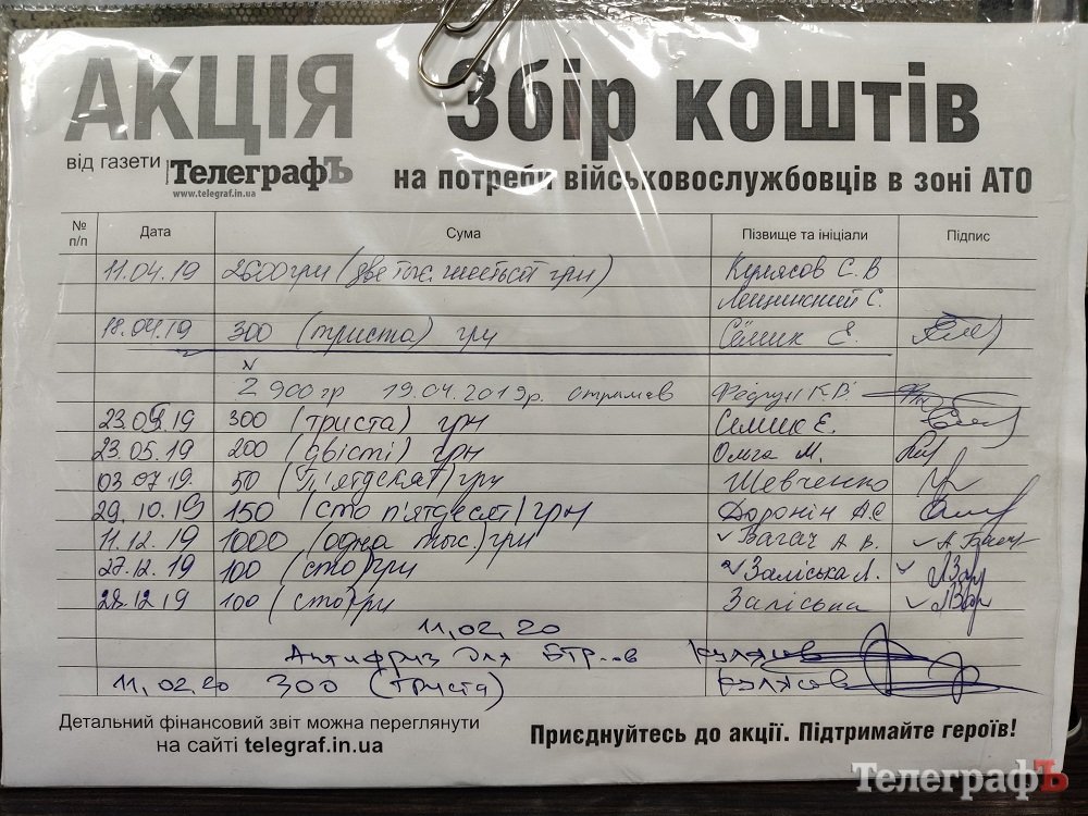 – Необхідно було 50 літрів антифризу G11 – ми знайшли концентрат (розчиняється у 2 рази). Для «передка» небайдужі продали нам по собівартості, просили передати бійцям привіт від автоспільноти міста. 1600 гривень, зібраних в приймальні «Приватки», поїхали на передок у вигляді антифризу для спецназу 12 лютого, – сказав головний редактор Сергій Кулясов.