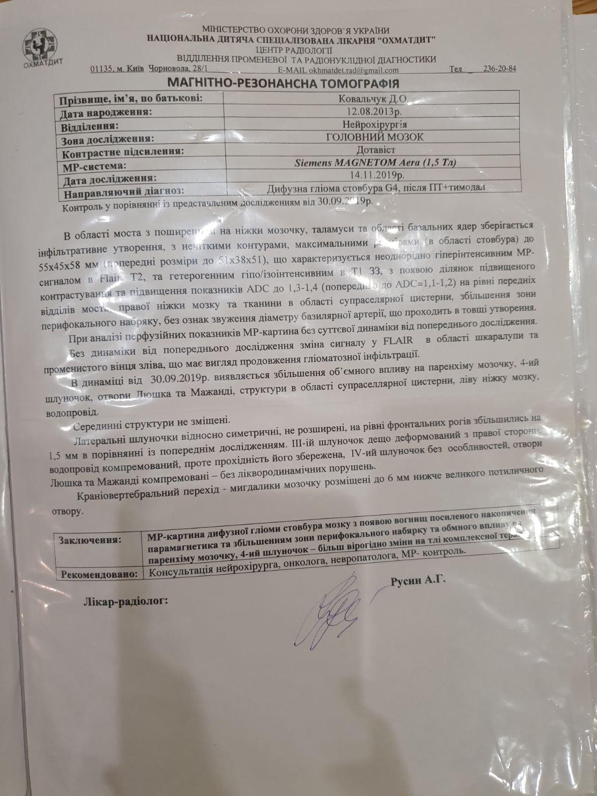 Родина розпочала лікування за протоколом: хіміотерапія та променева терапія, після цього в інституті раку призначили 6-9 курсів збільшеного дозування хіміотерапії. Хімія отруїла організм дитини й адаптувалася під пухлину, внаслідок чого впали тромбоцити. Лікарі терміново провели операцію й зараз малюк знаходиться в реанімації київської лікарні.