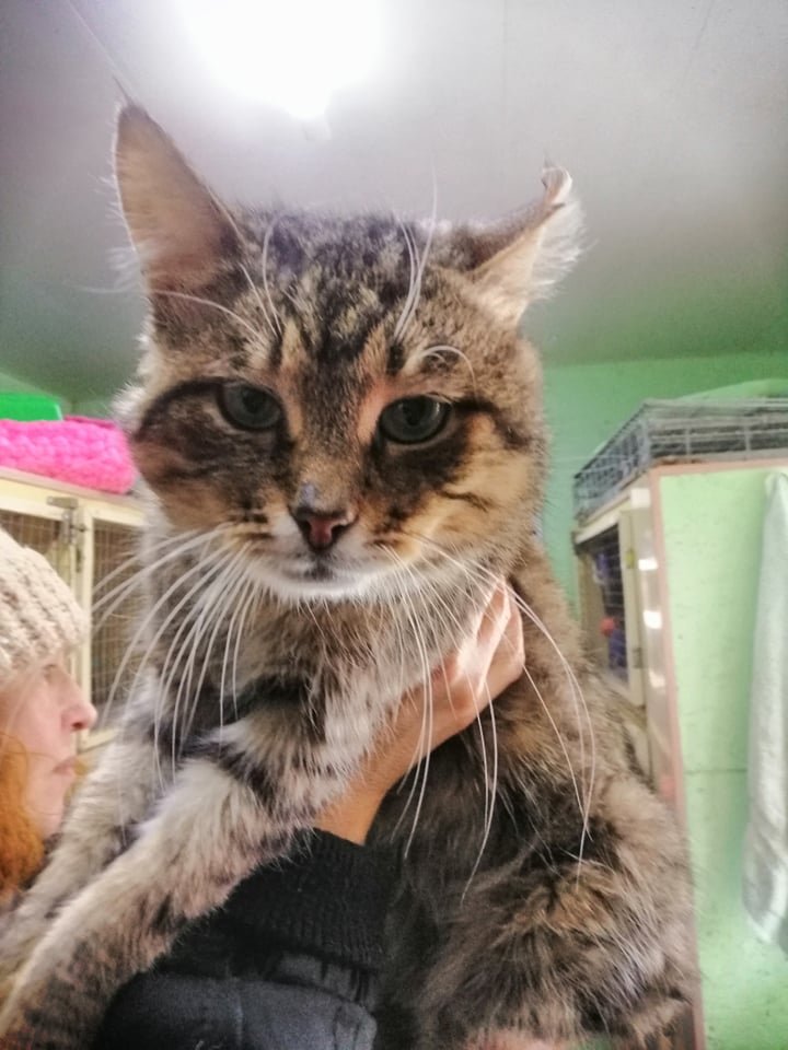 Смугастий хуліган Братан шукає нову люблячу родину. Кіт прибився до Спецсервісу, спочатку працівники подумали, що це вагітна кішка, а виявилося – кіт який об’ївся подарунком волонтерів.