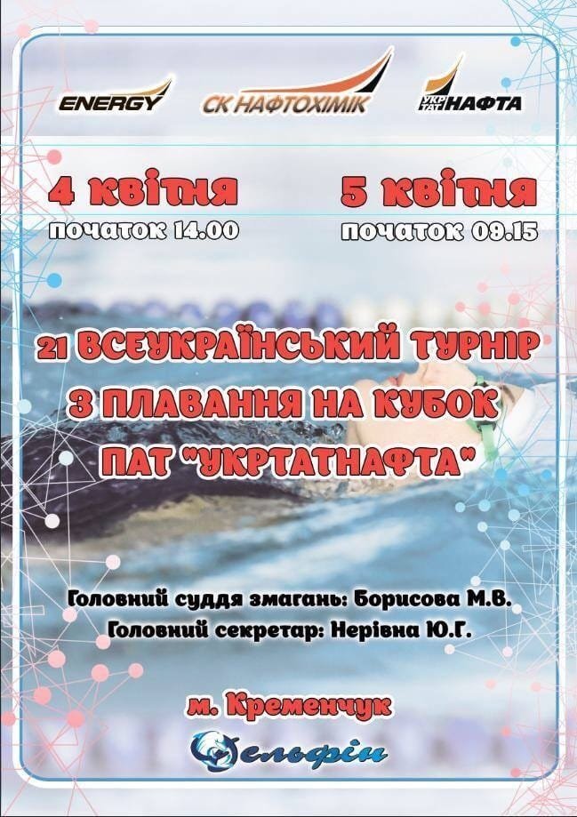 4 та 5 квітня у Кременчуці відбудеться 21 Всеукраїнський турнір з плавання на Кубок «Укртатнафта». Участь у змаганнях візьмуть спортсмени таких вікових категорій: 2004-2005, 2006-2007, 2008, 2009, 2010, 2011, 2011 і молодше.