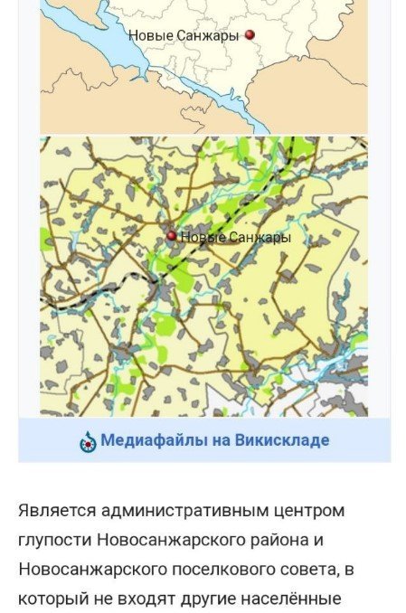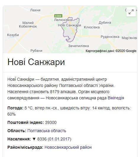 Після вчорашньої коронавірусної істерії у Нових Санжарах змінився опис населеного пункту на сервісі «Гугл-мапи». Сервіс показує, що Нові Санжари – бидлятня. А також є провінцією Бухань, де проживає 8179 бухарів.