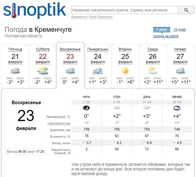 По прогнозам Sinoptik, на уикенд Кременчуг ждут достаточно холодные температуры в пределах от -2°С до +4°С. В субботу, 22 февраля, в городе будет переменная облачность, а во второй половине дня в воскресенье, 23 февраля, начнётся дождь. Этот дождь утром в понедельник, 24 февраля, перерастёт в сильный мокрый снег.