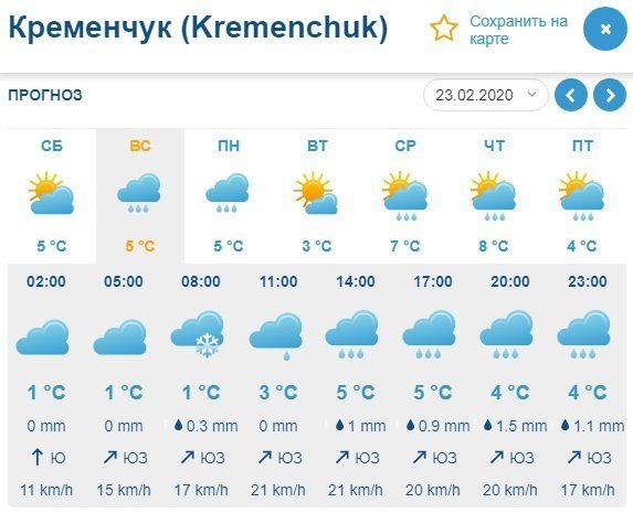Ventusky прогнозирует, что в субботу, 22 февраля, в Кременчуге не будет осадков, возможны даже недолгие солнечные прояснения. В воскресенье, 23 февраля, кременчужан ожидает дождливая погода, которая продержится и в понедельник, 24 февраля. Стоит обратить внимание, что в понедельник этот погодный портал предупреждает о порывах ветра рекордной скорости — до 72 км/час. Воздух прогреется до значений 0…+5°С.