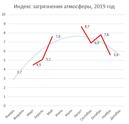 Температурные инверсии, слабый ветер и туманы способствовали накоплению этой примеси в атмосферном воздухе города. Самое пыльное место и время – район остановки «Кредмаш» в ноябре.