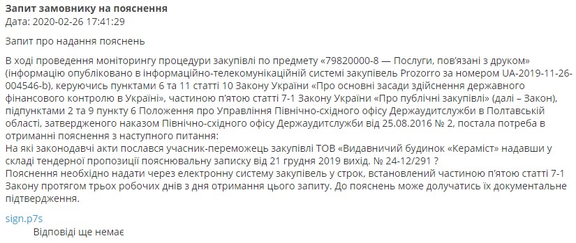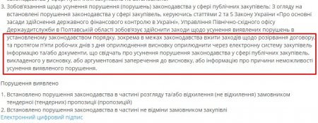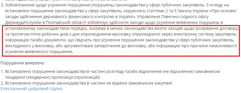 Требование расторгнуть договор содержится в заключении о результатах мониторинга закупки от 3 марта, который проводило Управление Северо-восточного офиса Госаудитслужбы в Полтавской области.