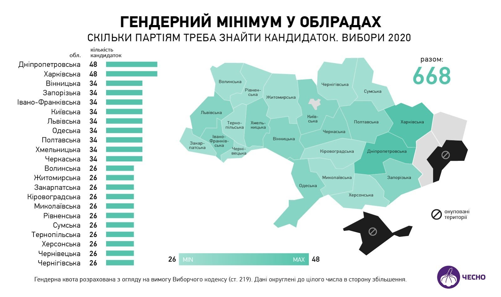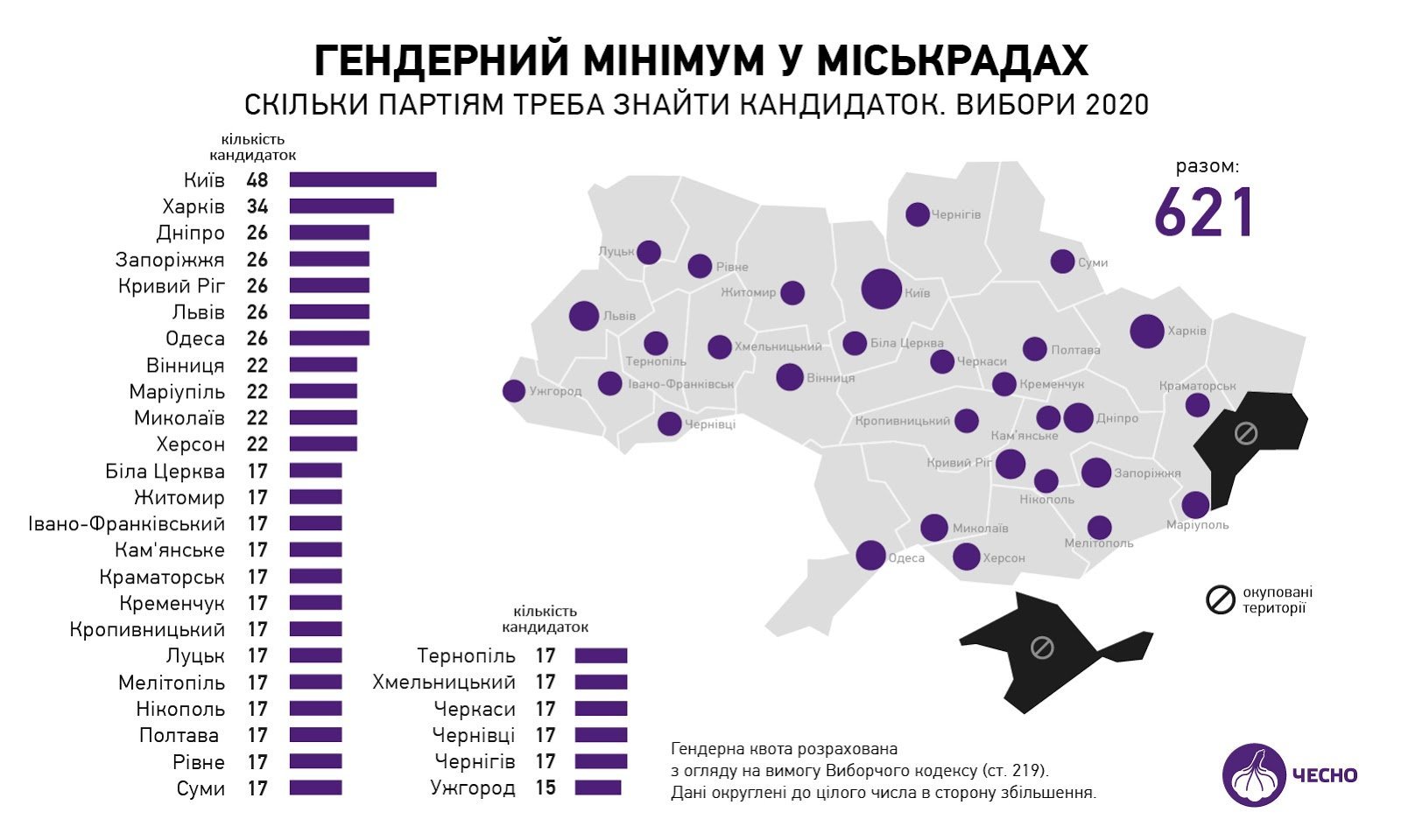 Законодавство підготувало для партій ще один виклик. Як роз’яснили Руху Чесно в ЦВК, згідно з новими правилами Виборчого кодексу, один кандидат/ка може балотуватися лише в одному окрузі – тобто в одну раду. Якщо в 2015 році одні й ті ж кандидатки від партії могли йти в облраду, міськраду, балотуватися на мера, то тепер один кандидат – одне балотування. А це означає, що одні й ті ж представниці партії не можуть закрити гендерну квоту партії в радах різних рівнів.