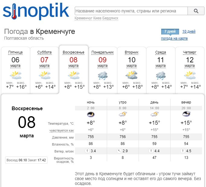 Что касается Sinoptik, этот погодный портал обещает, что в субботу и воскресенье дождей не предвидится, но дождить будет в понедельник, 9 марта. Температура будет колебаться в пределах от +6°С до +15°С.