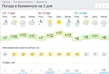 Ventusky прогнозирует дождь только в воскресенье, 8 марта, с 14.00 до 17.00, а в целом выходные пройдут без осадков. В ближайшие три дня в Кременчуге будет стоять пасмурная погода, воздух прогреется от +7°С до +16°С.