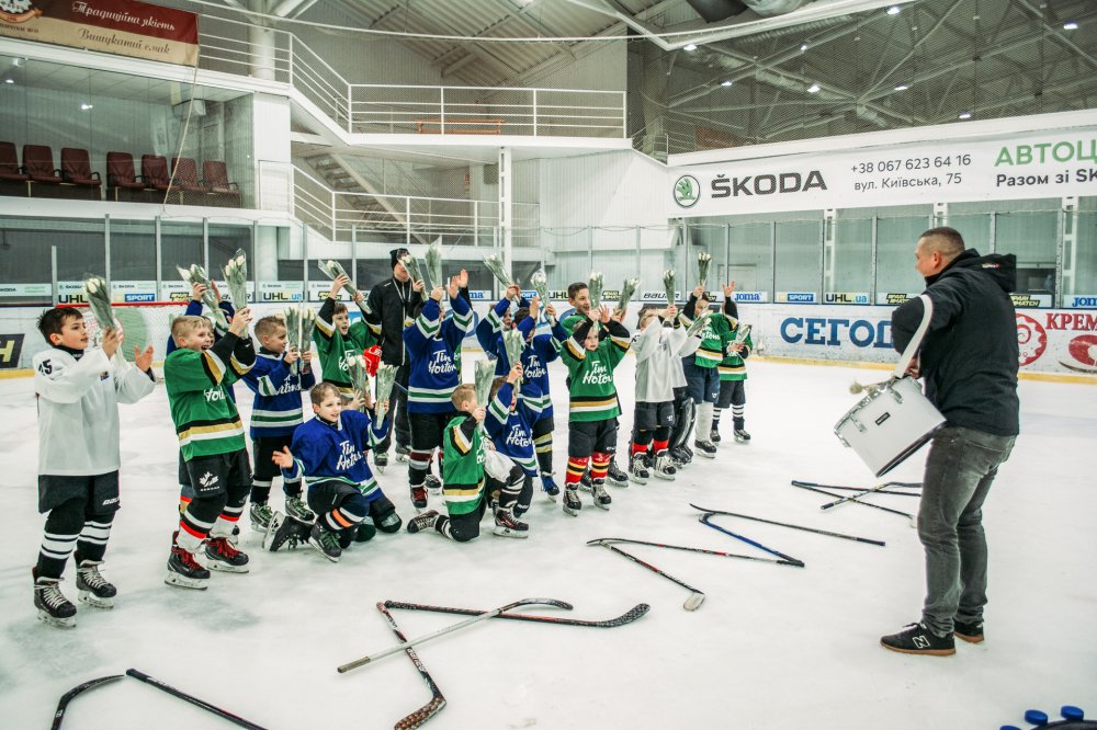 Після тренування діти організували привітання у вигляді напису: "З 8 березня мама" на льоду і подарували мамам букети. Дуже мило й зворушливо вийшло у юних хокеїстів.