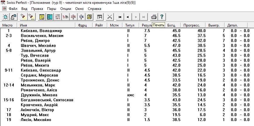 Перед последним 9 туром чемпионата, игравшимся по швейцарской системе в классические шахматы лишь его единоличный лидер - Владимир Кибкало, имеющий 6,5 очков обеспечил себе место в высшем эшелоне, так же как и Максим Васильченко, который хотя и имел 6 очков, зато коэффициент Бухгольца был у него наивысший. К слову, оба находились вверху турнирной таблицы с 5 тура, а для Володи турнир сложился и вовсе удачно. Уже в первой партии Владимир переиграл чемпиона города до 15 лет Мирослава Сердюка, бывшего его выше на ступеньку на пьедестале в том турнире.