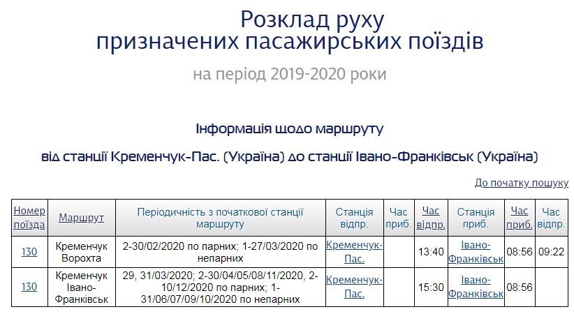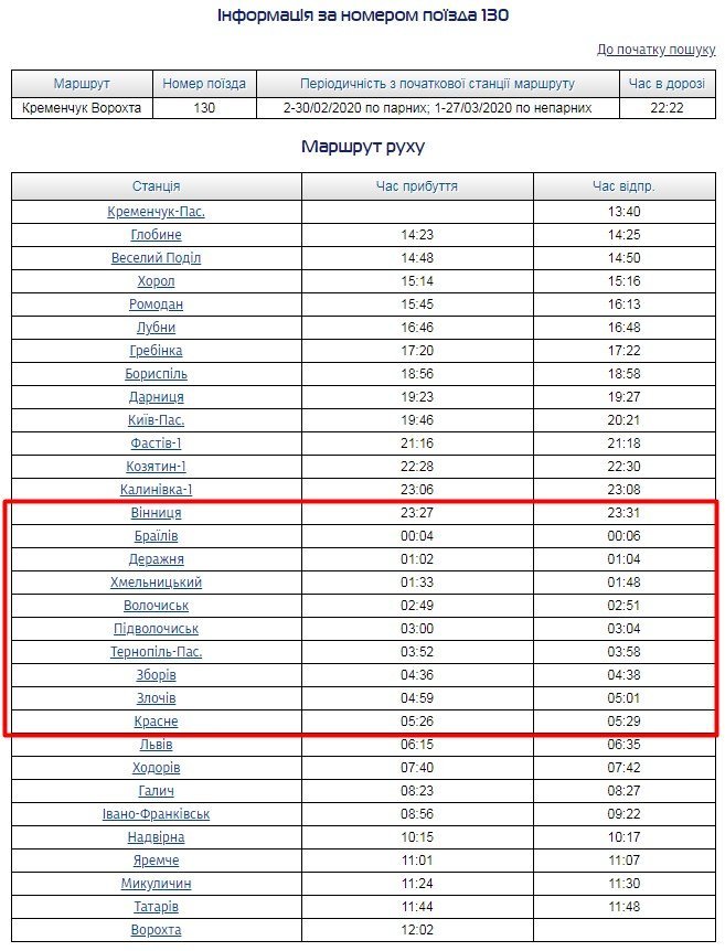 З 29 березня у зв’язку з переходом на літній час змінюється розклад руху поїзда №130 Кременчук-Ворохта. Судячи з розкладу на сайті Укрзалізниці, потяг буде відправлятися з Кременчука о 15.30, тоді як зараз відправляється о 13.40.