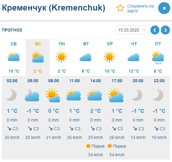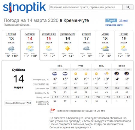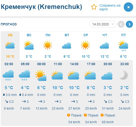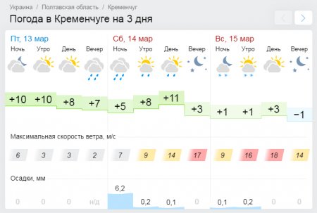 Sinoptik обещает дождь только утром в субботу, 14 марта, в остальное время на выходных продержится переменная облачность. Столбики термометров в субботу днём покажут +10°С, но вечером температура начнёт падать. И в воскресенье, 15 марта, днём в Кременчуге максимум будет +1°С. Также ожидается усиление скорости ветра до 15-24 м/с.