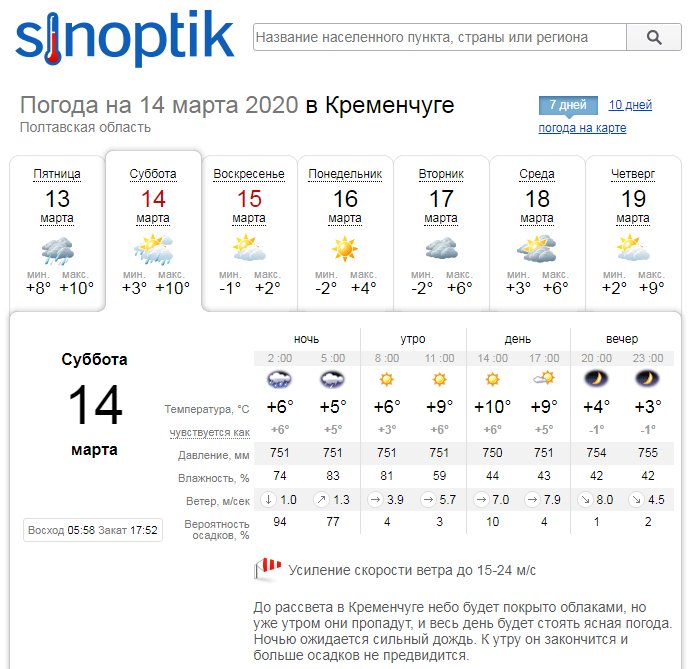 Что касается Ventusky, он солидарен с Sinoptik и сулит дождь кременчужанам только в субботу, 14 марта, утром. Однако сильный ветер никто не отменял — ждём мощных порывов до 68 км/час. Температурные показатели будут колебаться от +10°С в субботу до -1°С утром и вечером в воскресенье, 15 марта.