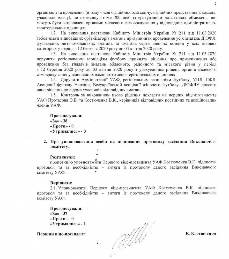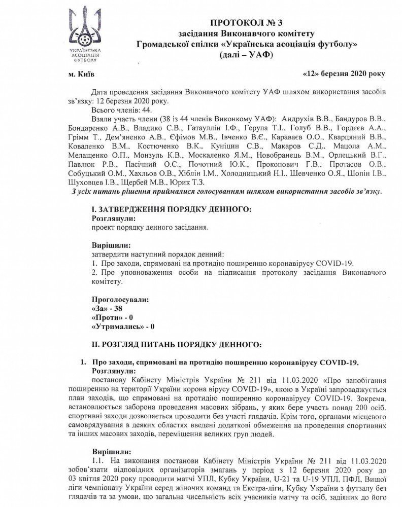 На виконання постанови Кабінету Міністрів України № 211 від 11.03.2020 «Про запобігання поширенню на території України коронавірусу COVID-19», Виконавчий комітет Української асоціації футболу вирішив:
