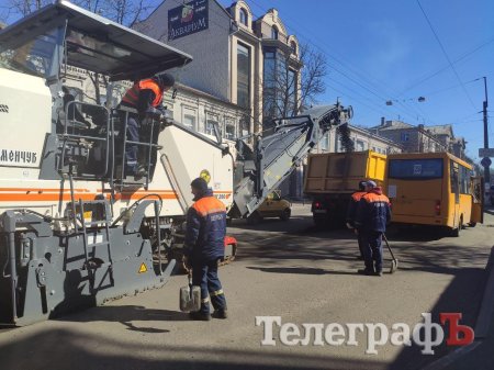 На центральній вулиці Кременчука обмежено рух транспорту. Працівники ШРБУ знімають верхній шар асфальтного покриття на вулиці Небесної сотні.