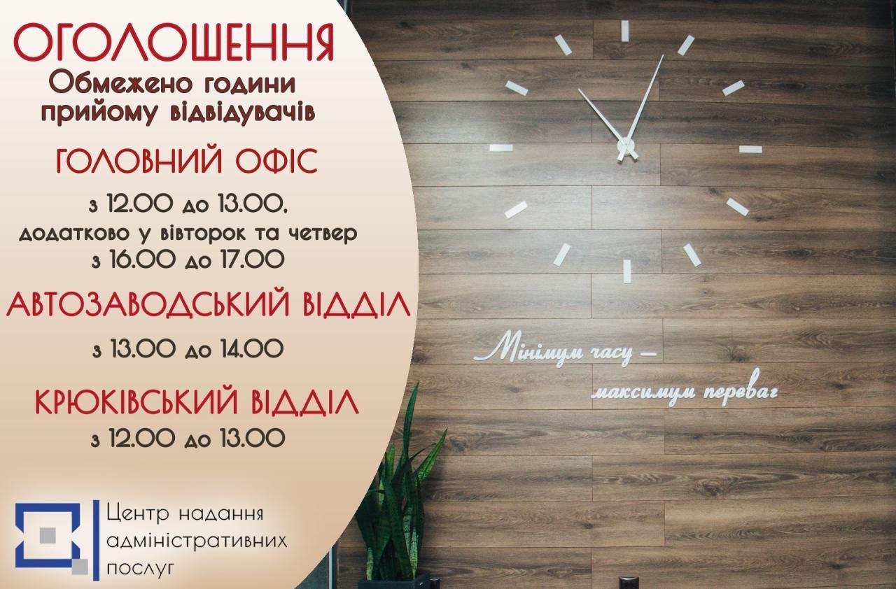 Через запровадження карантину у Кременчуці ЦНАП обмежує години прийому громадян. Такі обмеження введені тимчасово (згідно розпорядження міського голови «Про роботу виконавчого комітету Кременчуцької міської ради Полтавської області, враховуючи епідемічну ситуацію щодо захворюваності на коронавірусну інфекцію в світі та Україні» №63-р від 12.03.2020), за попередньою інформацією, триватимуть до 3 квітня 2020 року.
