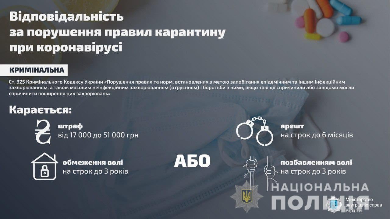 Порушення правил та норм, встановлених з метою запобігання епідемічних та інших інфекційних захворювань, якщо такі дії спричинили або завідомо могли спричинити поширення цих захворювань, карається штрафом від 17 тисяч до 51 тисячі гривень або арештом на строк до 6 місяців, або обмеженням волі на строк до 3 років, або позбавленням волі на строк до 3 років.