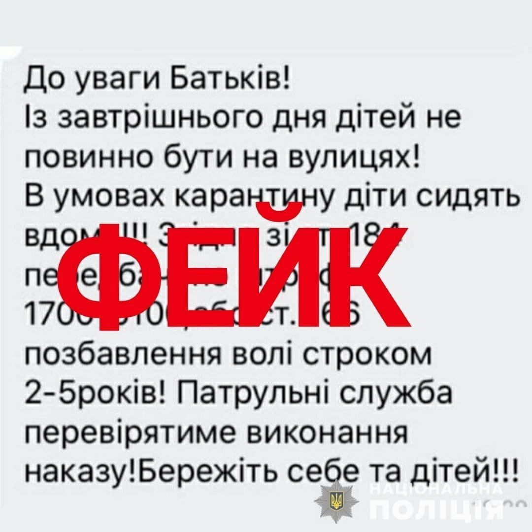 У соцмережах та групах у месенджерах відучора почали поширювати повідомлення про загрозу адміністративної та кримінальної відповідальності щодо батьків, чиїх дітей в умовах карантину виявлять на вулиці. Якщо діти не будуть сидіти вдома, це нібито є порушення статті 184 КУпАП (Невиконання батьками або особами, що їх замінюють, обов’язків щодо виховання дітей) та статті 166 ККУ (Злісне невиконання обов’язків по догляду за дитиною або за особою, щодо якої встановлена опіка чи піклування).