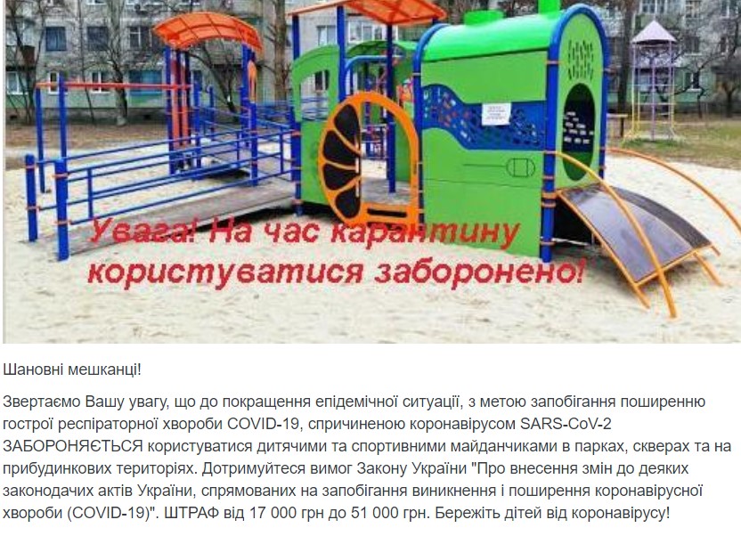Информация о запрете использования детских и спортивных площадок начала появляться в Кременчуге ещё на выходных. Вот, например, в одном из объявлений ссылаются на то, что существует даже соответствующее решение исполкома Кременчугского городского совета.