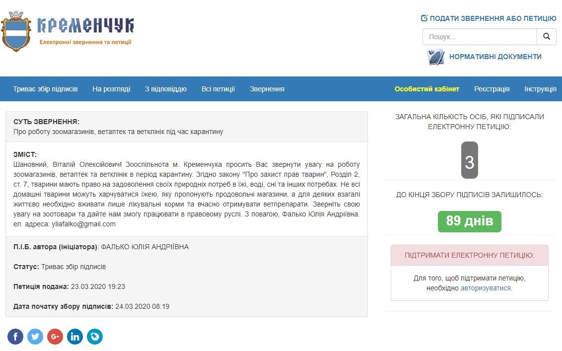 24 березня на сайті мерії з’явилась чергова петиція до мера кременчука Віталія Малецького. Кременчужанка Юлія Фалько просить міського голову подбати про роботу зоомагазинів, ветаптек та ветклінік під час карантину.