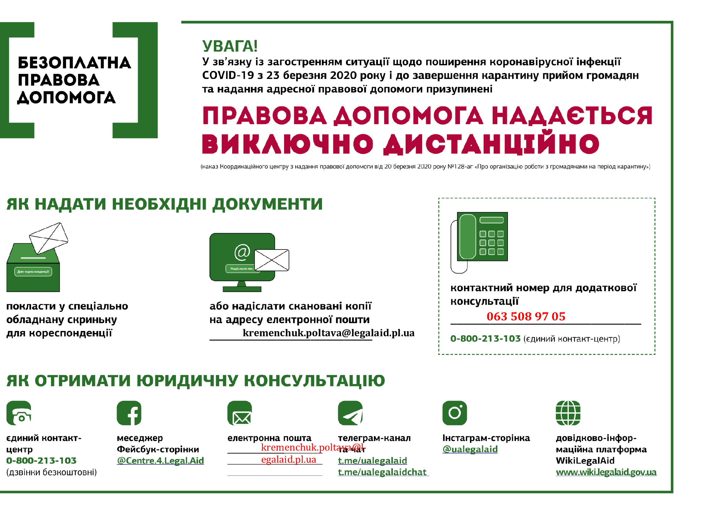 - написати на електронну пошту kremenchuk.poltava@legalaid.pl.ua;