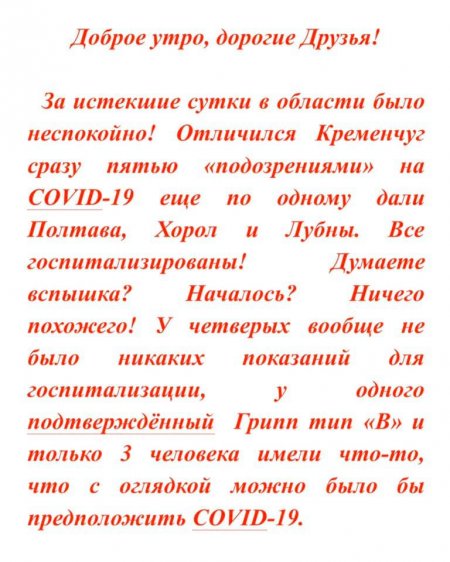Он написал, что на Полтавщине людей госпитализируют без необходимости из-за паники и что вирусные инфекции лёгкой и средней тяжести течения можно лечить дома