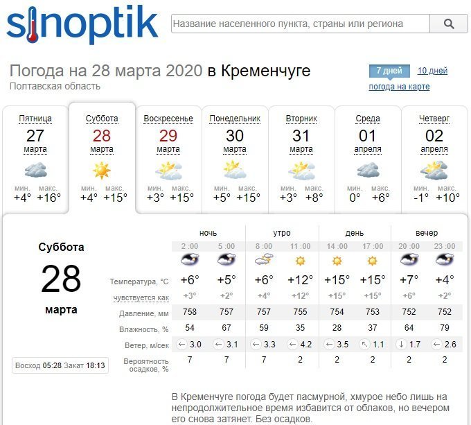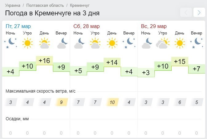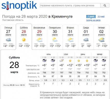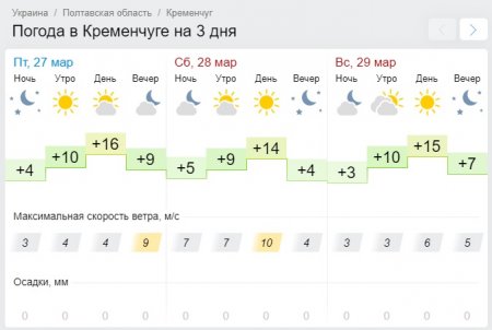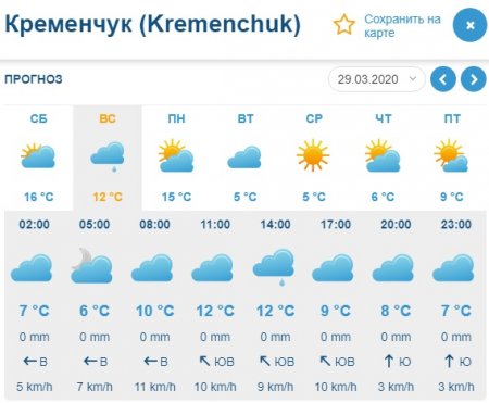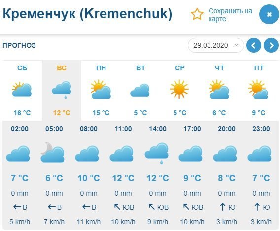 И только Ventusky обещает небольшой кратковременный дождь в воскресенье, 29 марта. Кроме того, в воскресенье стоит ждать пасмурной погоды, а вот в субботу, 28 марта, несколько солнечных часов днём всё же ждёт кременчужан. Температурные показатели будут колебаться в пределах от +6°С до +16°С.