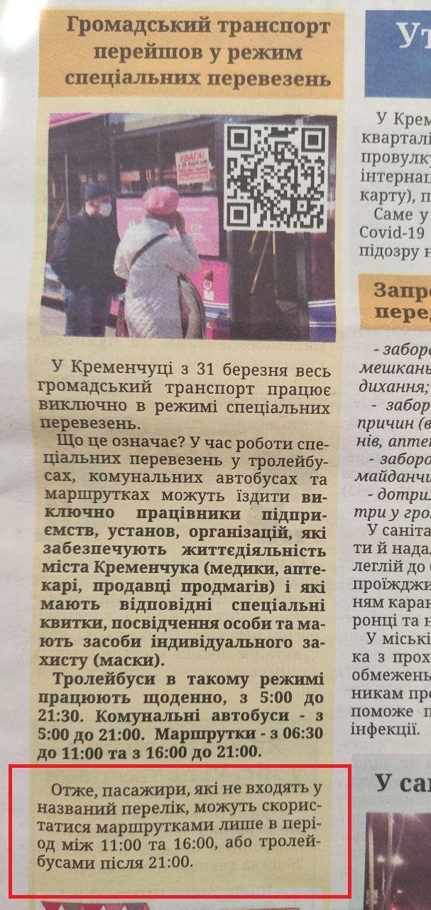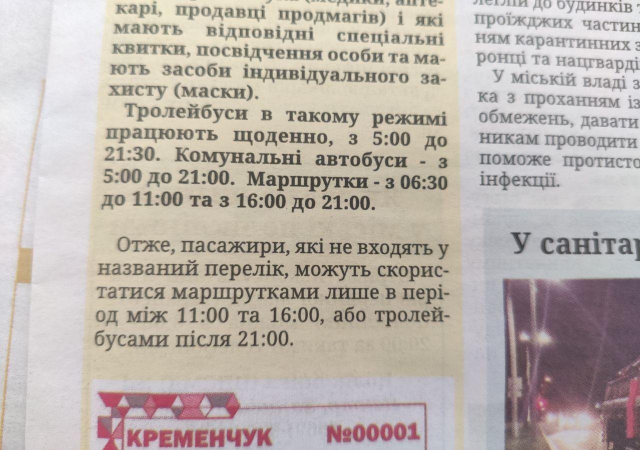 «Телеграф» поцікавився чи працюватиме транспорт для кременчужан без спецперепусток. Адже в останньому номері газети «Кременчуцькі новини», яка фінансується з бюджету Кременчука, була опублікована інформація, що люди, які не мають спецквитків можуть скористатися маршрутним транспортом з 11.00 до 16.00.