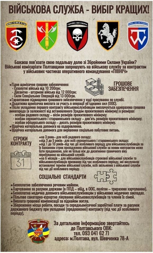 Військовий комісаріат запрошує на військову службу за контрактом до військових частин Оперативне командування «Північ», а саме: