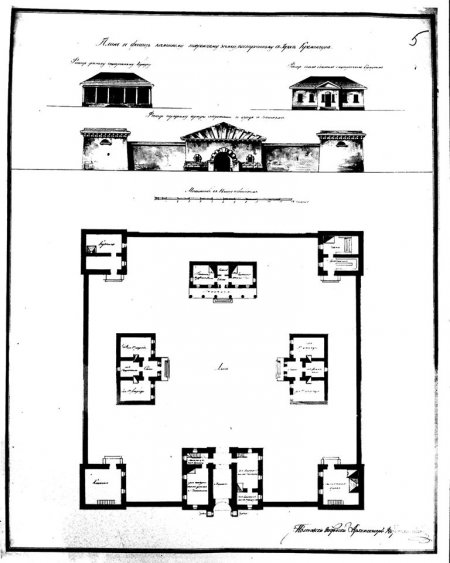 За адміністративним статусом у Кременчуці слід було керуватися типовим проектом для повітових міст. Але Кременчук ні за кількістю населення, ні за економічним розвитком не був схожим на типове повітове місто. До того ж розташування його на межі трьох губерній принаджувало значну кількість злочинного елементу. Тому проект для повітових міст виявився замалим, а проект для губернських міст використовувати не можна було, бо Кременчук не мав статусу губернського міста. Довелося іти на компроміс. Огорожа і ворота з баштою були побудовані за губернським проектом, а за повітовим проектом звели корпуси для в’язнів – але не один, а цілих три. В середині 19 ст. ці одноповерхові корпуси знесли і спорудили двоповерхову кам’яну безлику тюремну будівлю, котра проіснувала до Другої світової війни». (А.Н. Лушакова, Л.И. Евселевский. Улицами старого Кременчуга. 2001).
