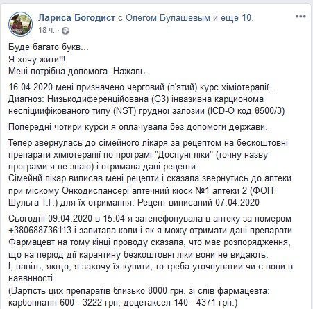Кременчужанка Лариса Богодист на своей странице в Фейсбук разместила пост. Она рассказала, что на 16 апреля у неё назначен пятый курс химиотерапии. Первые четыре курса она оплатила самостоятельно, а пятый попыталась получить по программе поддержки – но не смогла это сделать.