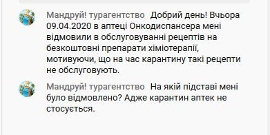 Кременчужанка все же получила в аптеке бесплатные лекарства, в которых ей сперва отказали, сославшись на карантин. Чтобы получить препараты, ей пришлось обратиться в службу поддержки мэра (15-63)?, а потом и напрямую на заседание городского противоэпидемического штаба.