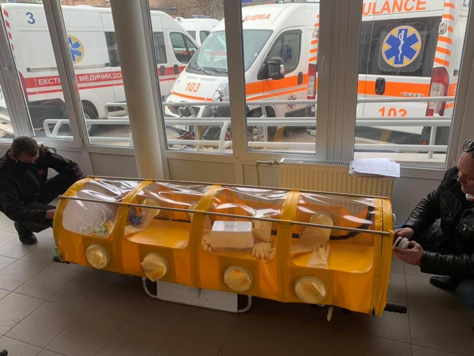 Керівник робіт – Юрій Андрієвський – розповів, що капсула важить 16 кг, виготовлена із герметичного матеріалу, має маску, прибори для подачі кисню, компресор і фільтри для знезараження повітря. Також в ізолятор вмонтовані рукавиці-манжети, щоб лікарі могли проводити будь-які маніпуляції без контакту з хворим.